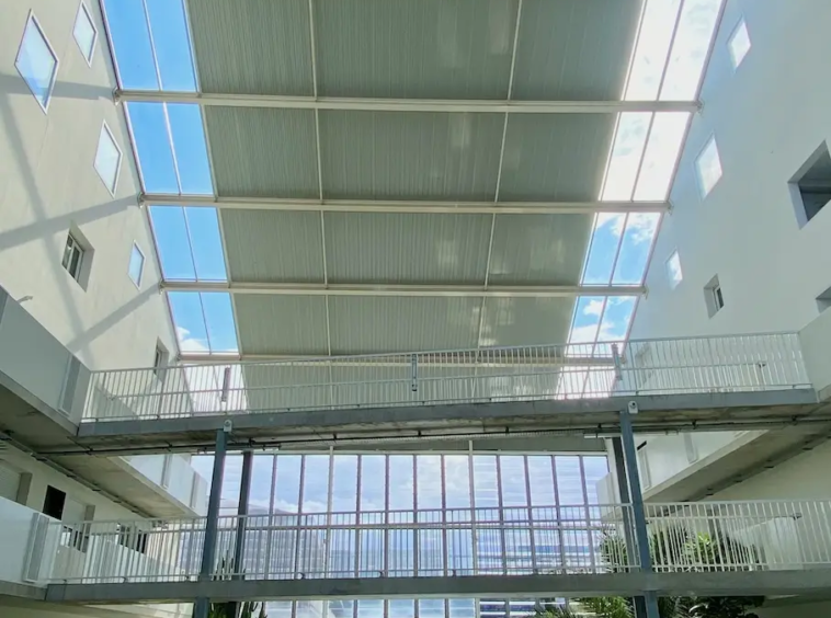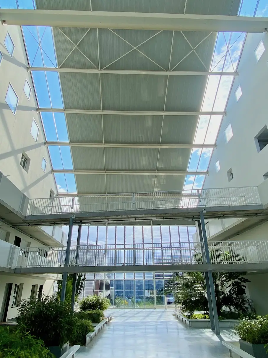 Le balcon offre une belle vue dégagée vers l’abondante végétation de la résidence