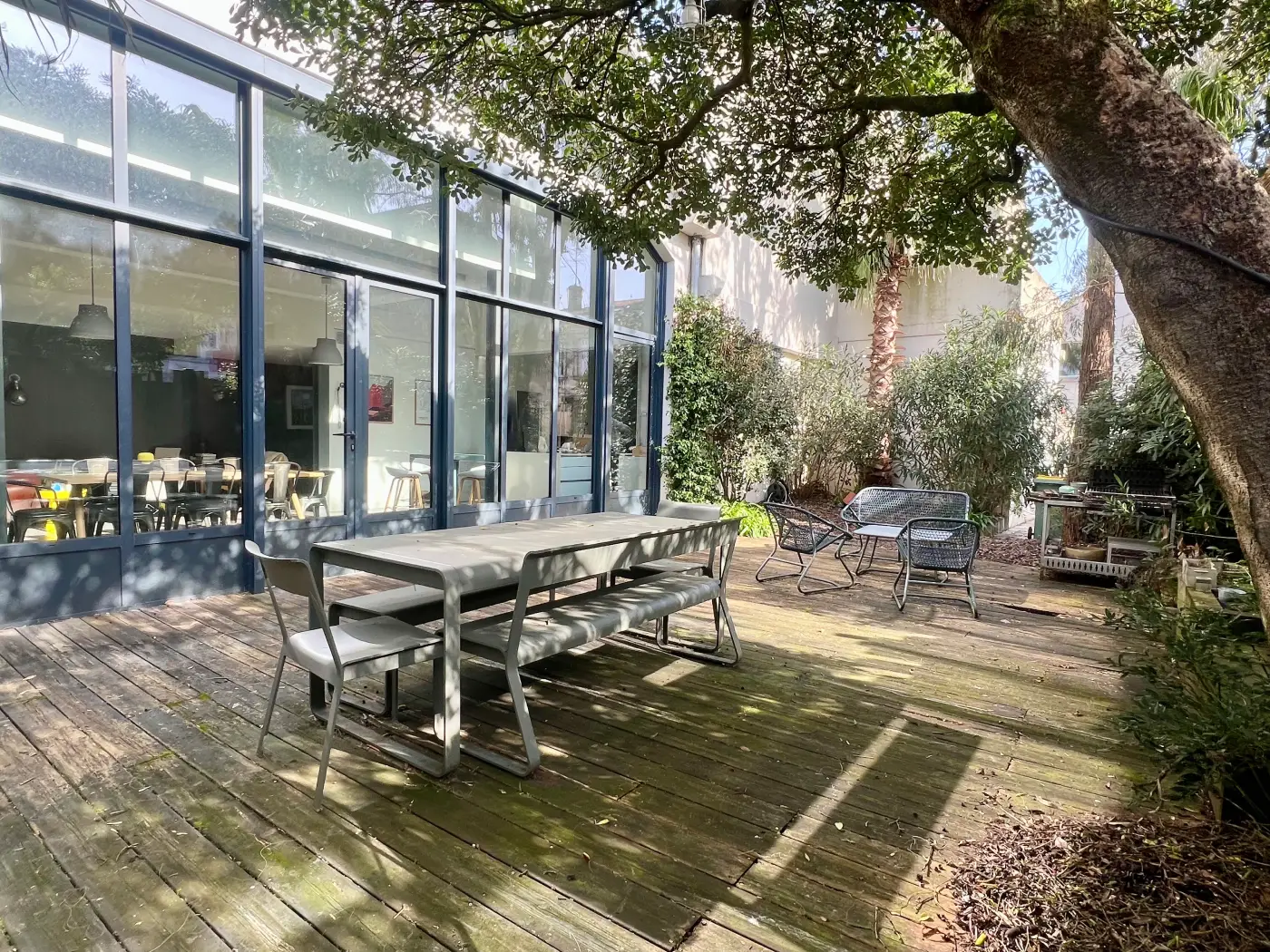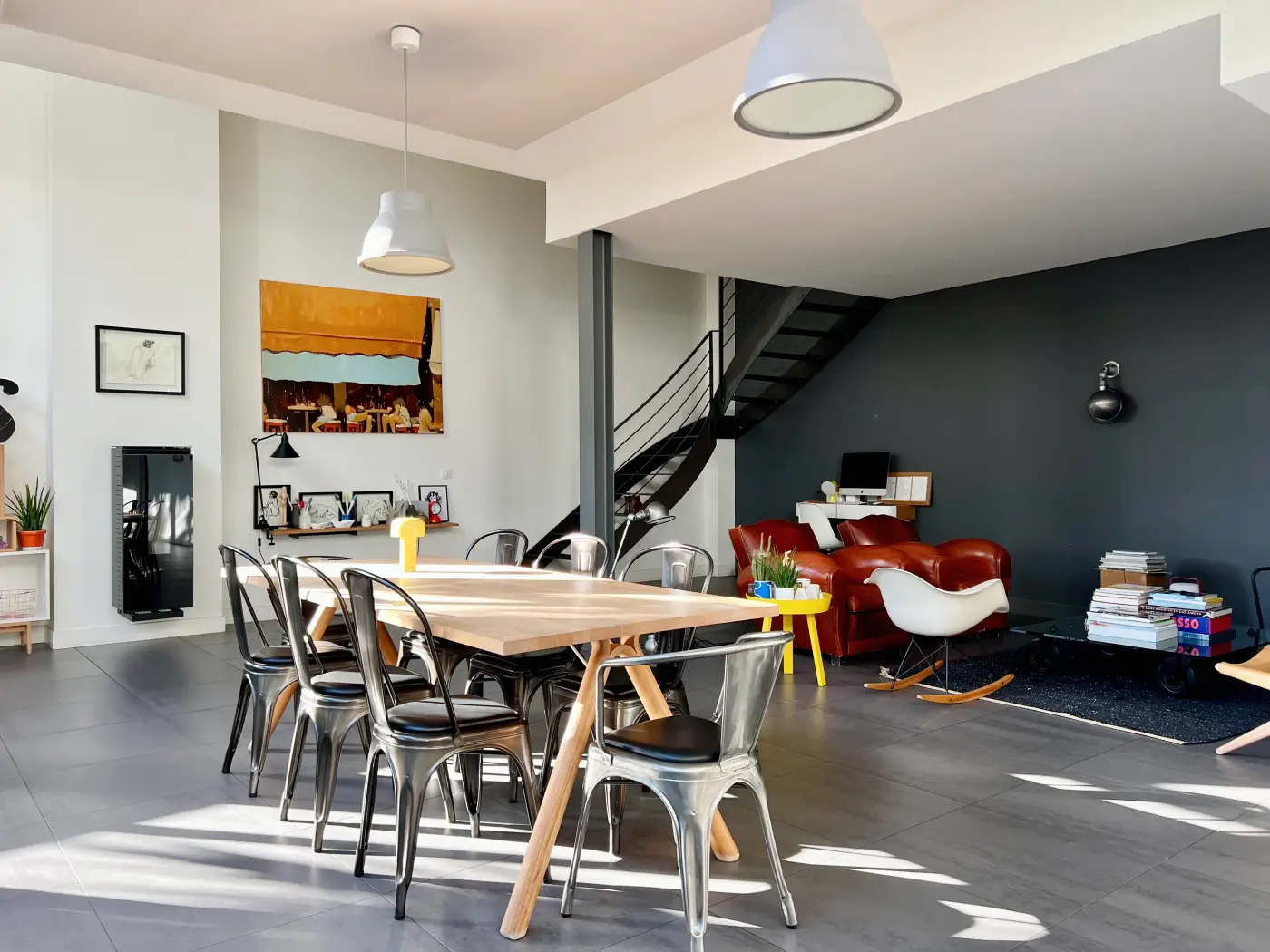 La maison s’organise autour d’une spectaculaire pièce de vie baignée de lumière. Sublimé par de larges verrières de style atelier, cet espace de vie contemporain à l’esprit loft est convivial et chaleureux.