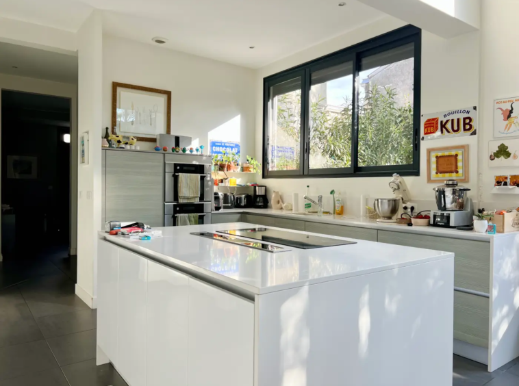 La cuisine ouverte avec îlot central est moderne et parfaitement équipée. Elle s’intègre harmonieusement à cet espace de réception.